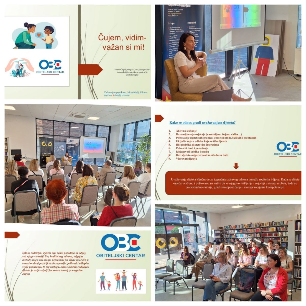 Dana 29. travnja 2025. godine od 18.00 do 19.00 sati u prostoru Gradske knjižnice i čitaonice Đakovo održano je predavanje pod nazivom „Čujem, vidim- važan si mi" koje je održala stručna radnica Obiteljskog centra, Područne službe Osječko- baranjske Daria Čagalj, mag.act.soc., specijalizantica transakcijske analize u području psihoterapije.