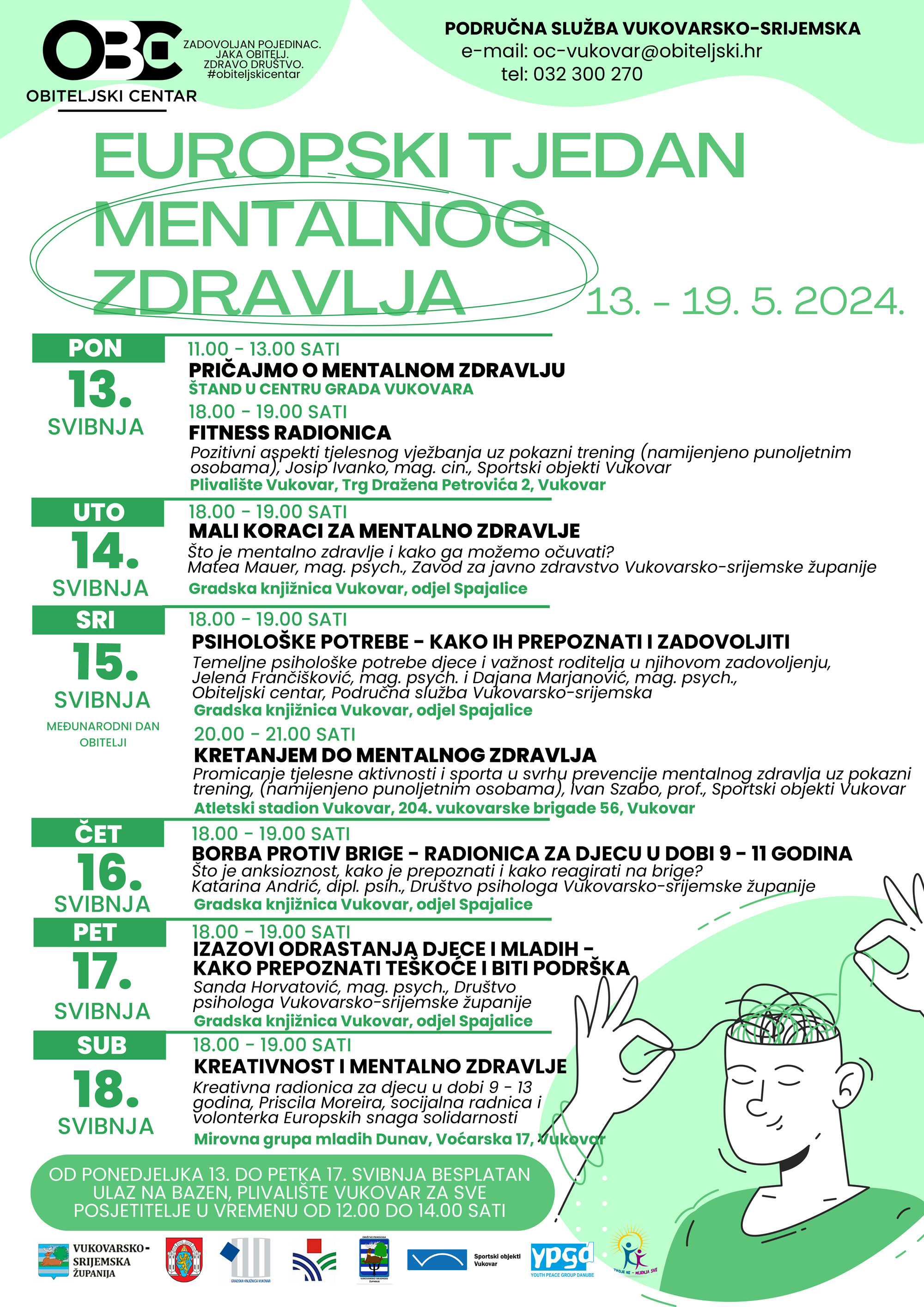 Aktivnosti započinju dana 13. svibnja kada ćemo biti na štandu u centru Vukovaru od 11.00 do 13.00 sati. Naša Područna služba upoznat će sve zainteresirane posjetitelje s programom aktivnosti kroz tjedan, s uslugama Obiteljskog centra te će se posjetitelji moći uključiti u kviz o mentalnom zdravlju. Sudionici kviza imat će priliku osvojiti prigodne promotivne nagrade. Važnost mentalnog zdravlja promovirat će se kroz više aktivnosti u navedenom tjednu: stručna predavanja, radionice za djecu te sportske aktivnosti.