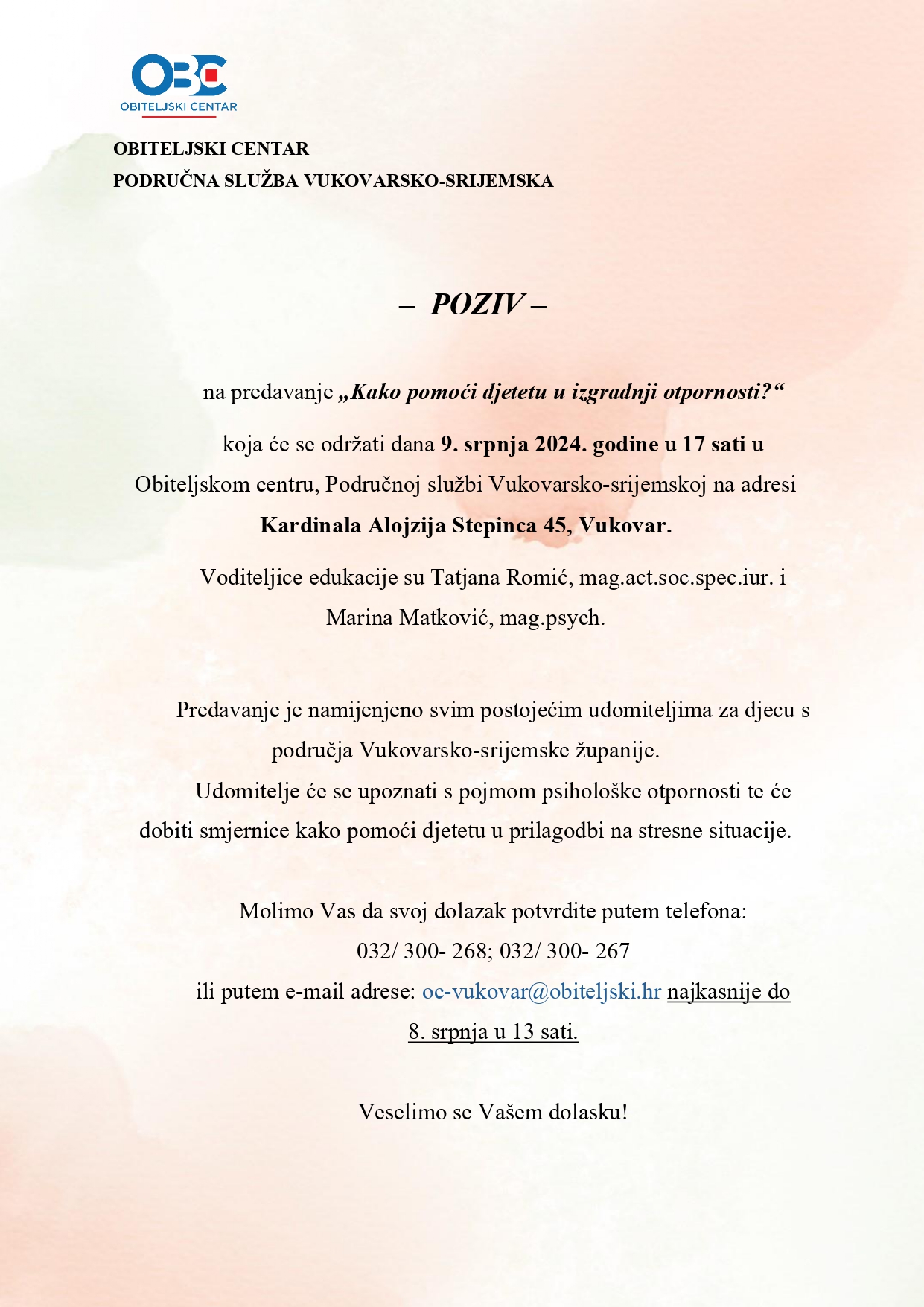 Predavanje će održati stručne radnice područne službe Tatjana Romić, mag.act.soc.spec.iur. i Marina Matković, mag.psych., dana 9. srpnja 2024. godine u 17.00 sati u prostoru Obiteljskog centra, Područne službe Vukovarsko-srijemske na adresi Kardinala Alojzija Stepinca 45, Vukovar.