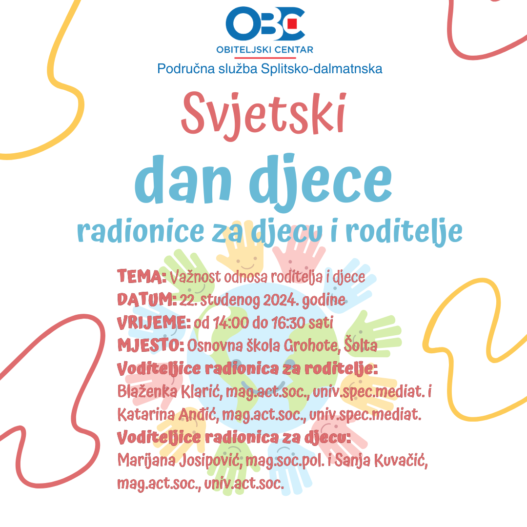 Povodom obilježavanja Svjetskog dana djece (20. studenog), Obiteljski centar, Područna služba Splitsko-dalmatinska, uz financijsku potporu Splitsko-dalmatinske županije te u suradnji s Udrugom za socijalnu integraciju svih dobnih skupina otoka Šolte „Osmijeh" i Osnovnom školom Grohote, provest će radionice za roditelje i njihovu djecu (predškolske dobi i učenika razredne nastave), na temu važnosti odnosa roditelja i djece, a s ciljem poticanja odgovornog roditeljstva, podupiranja dobrobiti obitelji i podizanja kvalitete života djece.