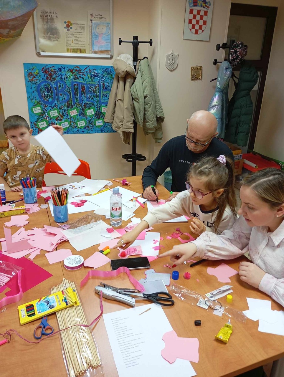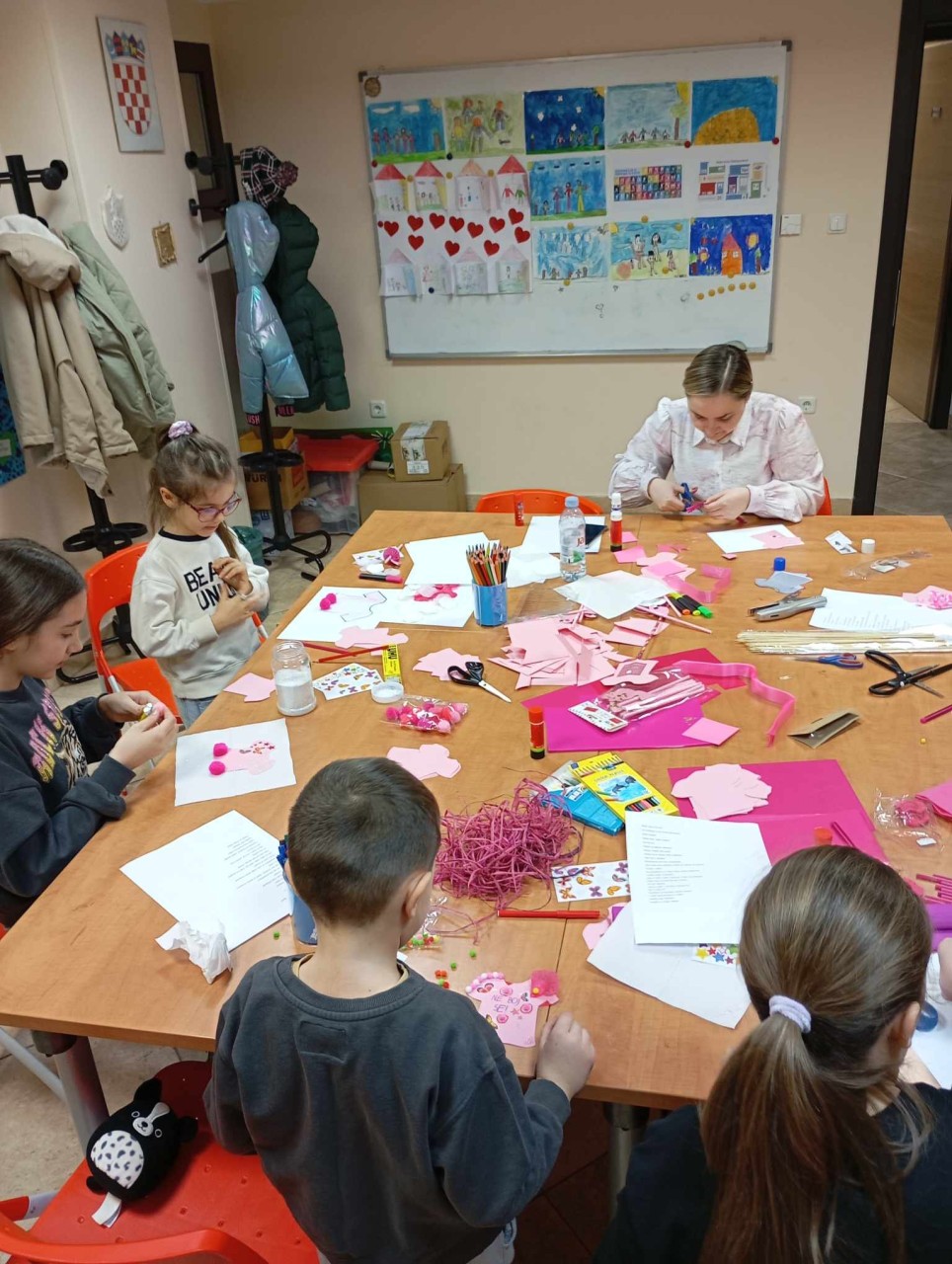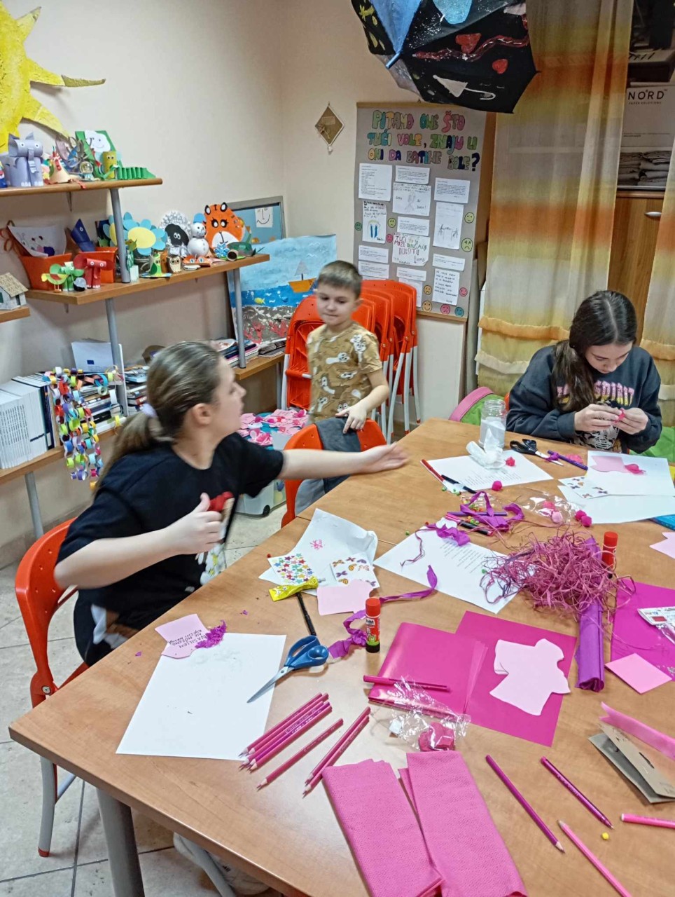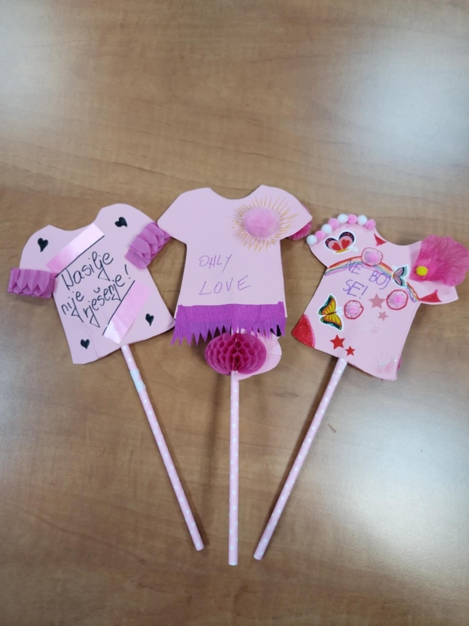 Ove godine smo aktivnosti obilježavanja ovog važnog dana započeli u tjednu prije odlaska učenika na školske praznike kada su učenici Osnovne škole Silvija Strahimira Kranjčevića u Senju uz vodstvo svojih učitelja i nastavnika kao odgovor na navedenu temu osmišljavali poruke koje promoviraju nenasilje. Prikupljene poruke o nenasilju poslužile su kao predložak djeci koja su u utorak, 25. veljače 2025. godine sudjelovala u kreativnoj radionici u prostorijama Obiteljskog centra, Područnoj službi Ličko – senjskoj, na kojoj smo ih upoznali s važnošću i značenjem obilježavanja Dana ružičastih majica. Djeca su pritom pokazala da doista razumiju važnost poticanja na nenasilje i suradnju, a svoju kreativnost pokazala su izradom papirnatih ružičastih majica s porukama nenasilja koje su dodatno ukrasili s različitim dodacima.