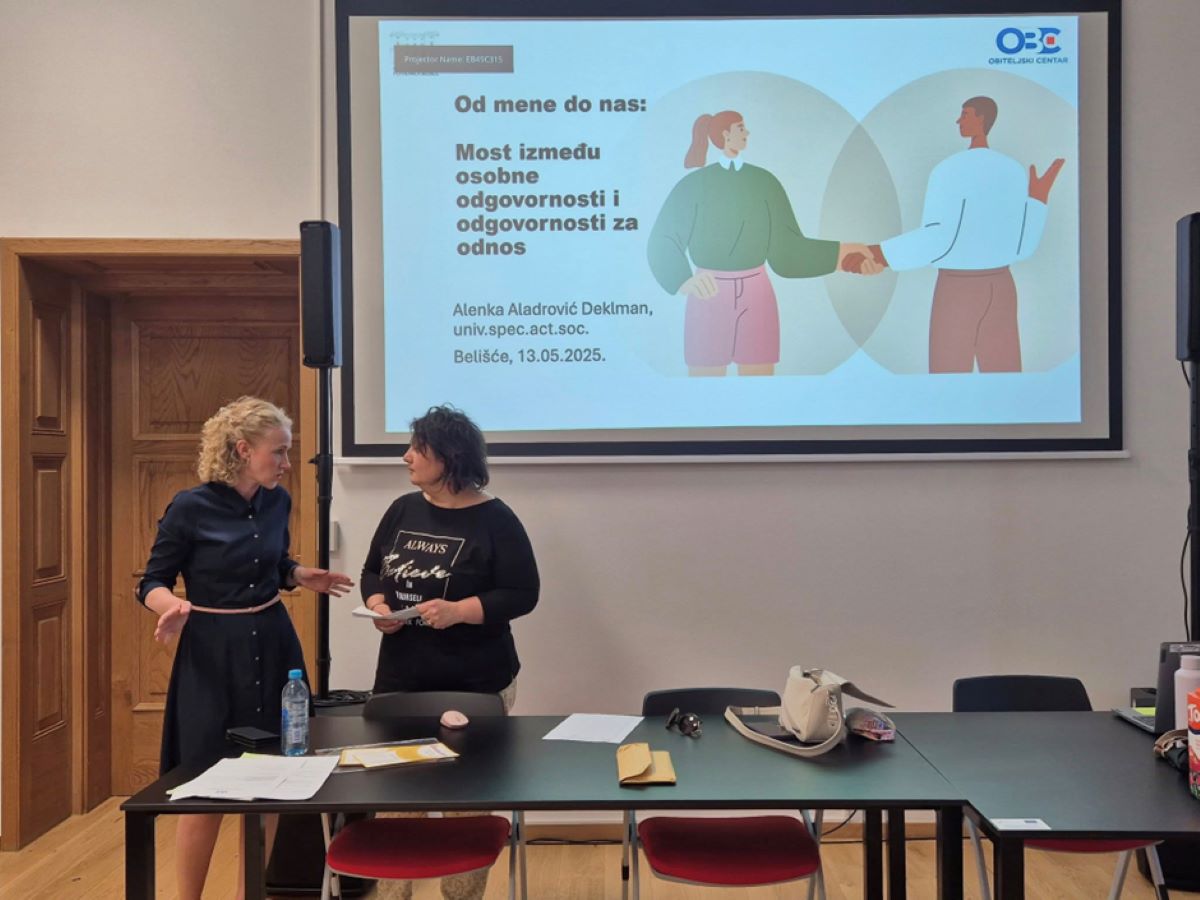 U utorak, 13. svibnja 2025. godine održano je predavanje pod nazivom „Od mene do nas: Most između osobne odgovornosti i odgovornosti za odnos" u suradnji s Gradskom knjižnicom i čitaonicom Belišće u Belišću. Dana 9. svibnja 2025. godine održana je i radionica na istu temu s članicama Županijskog tima za udomiteljstvo Hrvatskog zavoda za socijalni rad.
