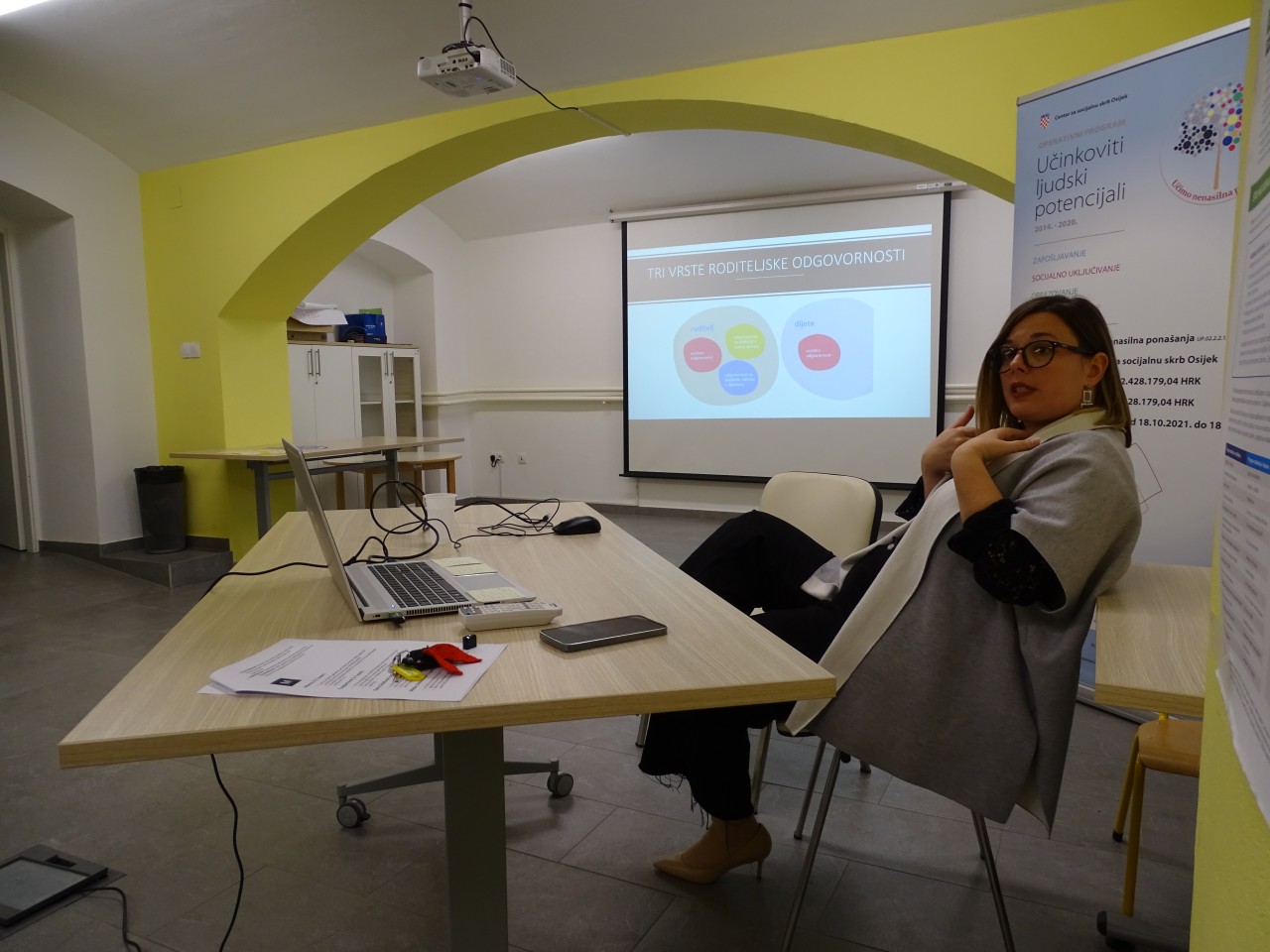 U utorak, 5. studenoga 2024.g. u prostoru Obiteljskog centra, Područne službe Osječko-baranjske održano je predavanje za sve zainteresirane građane na temu „Roditeljsko vodstvo i postavljanje granica". Predavanje je održala stručna radnica Martina Špaček, dipl.psih.-prof., savjetnica.