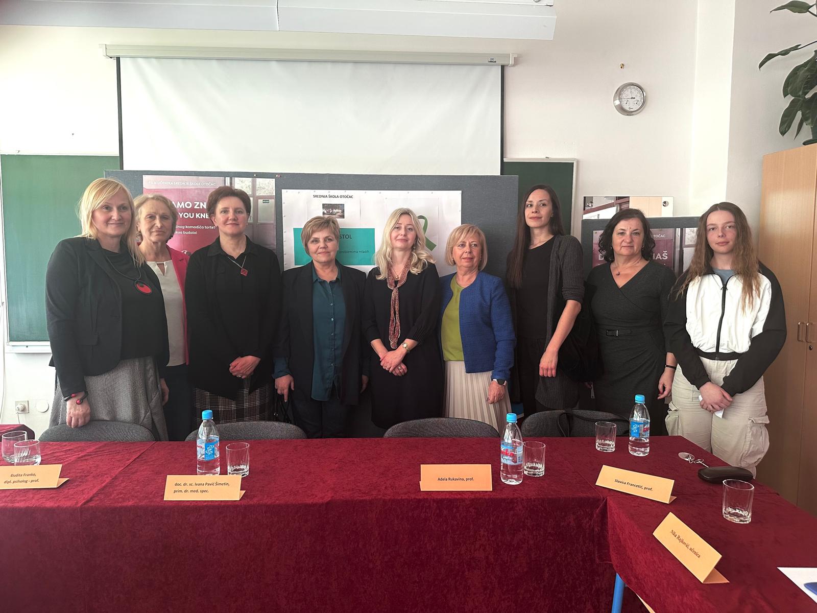 Na Okruglom stolu, uvodno su govorile prim. dr. sc. Ivana Pavić Šimetin, dr. med., zamjenica ravnatelja, voditeljica Službe za školsku medicinu, mentalno zdravlje i prevenciju ovisnosti Hrvatskog zavoda za javno zdravstvo, Tatjana Marinić, dr.med.spec. obiteljske medicine, Đudita Franko, dipl. psiholog - prof., viša savjetnica za stručne suradnike psihologe i nastavnike psihologije pri Agenciji za odgoj i obrazovanje, ravnateljica Srednje škole Otočac prof. Adela Rukavina, prof. Slavica Francetić, prof. Snježana Jovanović dipl. sociologinja i voditeljica projekta " Da samo znaš" te voditeljica Obiteljskog centra, Područne službe Ličko – senjske Suzana Svetić, mag.paed.soc.