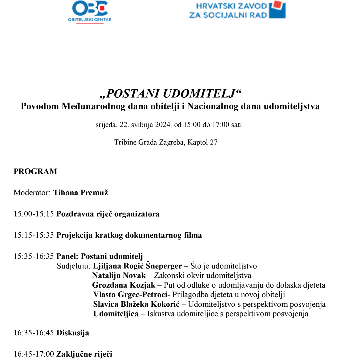 Događaj je prijavljen Hrvatskoj komori socijalnih radnika, Hrvatskoj psihološkoj komori i Hrvatskoj komori socijalnih pedagoga.