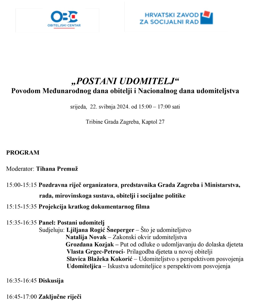 koji će se održati u srijedu, 22. svibnja 2024. od 15:00 do 17:00 sati u dvorani Tribine Grada Zagreba, Kaptol 27.