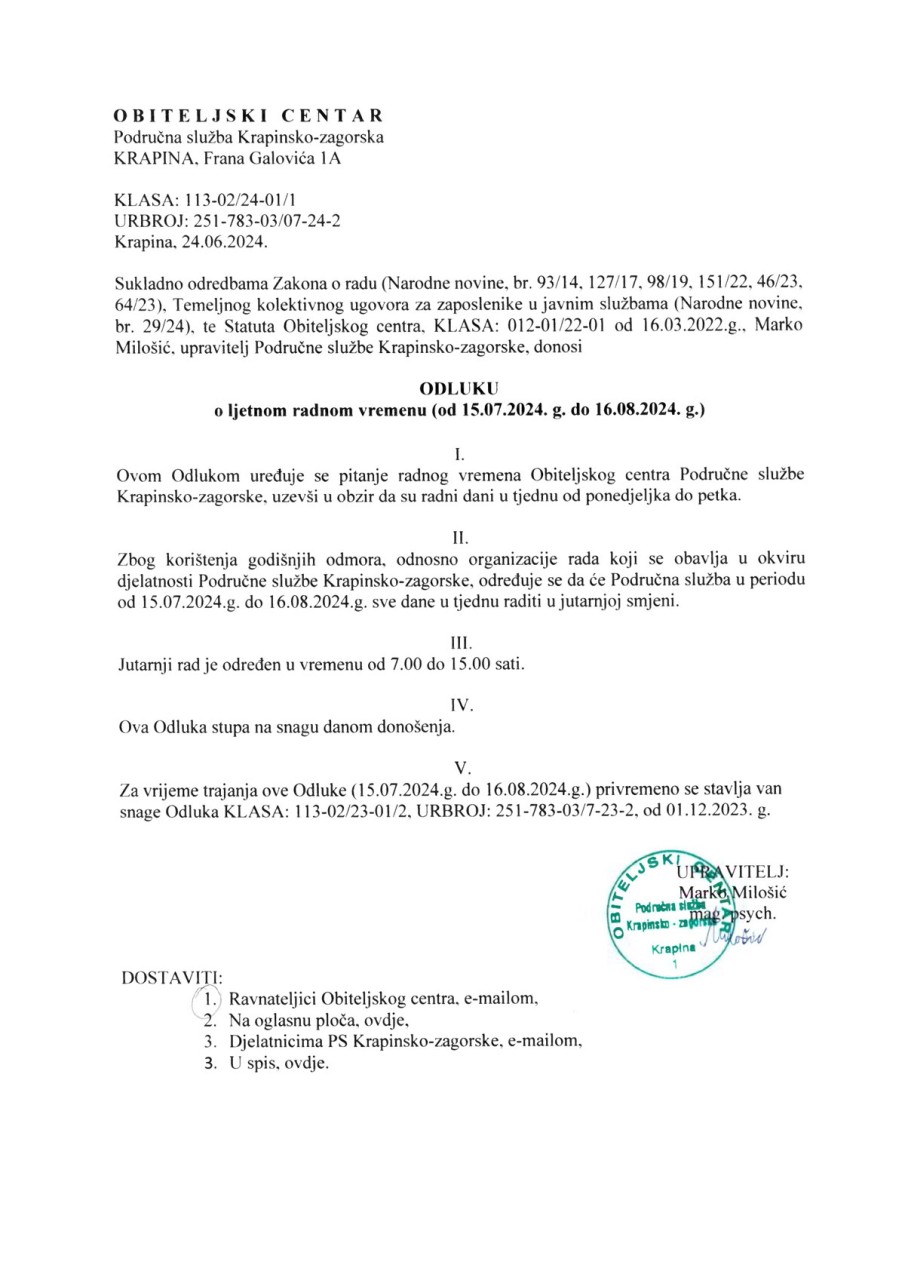 Odluka o ljetnom radnom vremenu (od 15.07.2024. g. do 16.08.2024. g.)