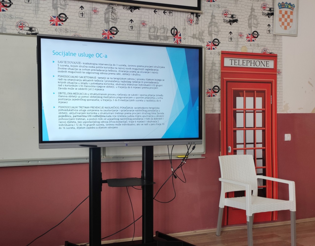 Voditeljica Područne službe upoznala je prisutne pedagoge iz osnovnih i srednjih škola s područja Brodsko-posavske županije, kroz prezentaciju s djelovanjem i uslugama koje pruža Obiteljski centar te aktivnostima koje se predviđaju tijekom 2024.g.