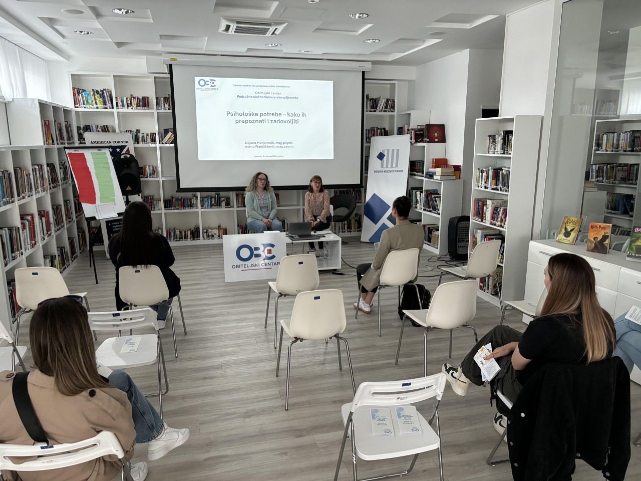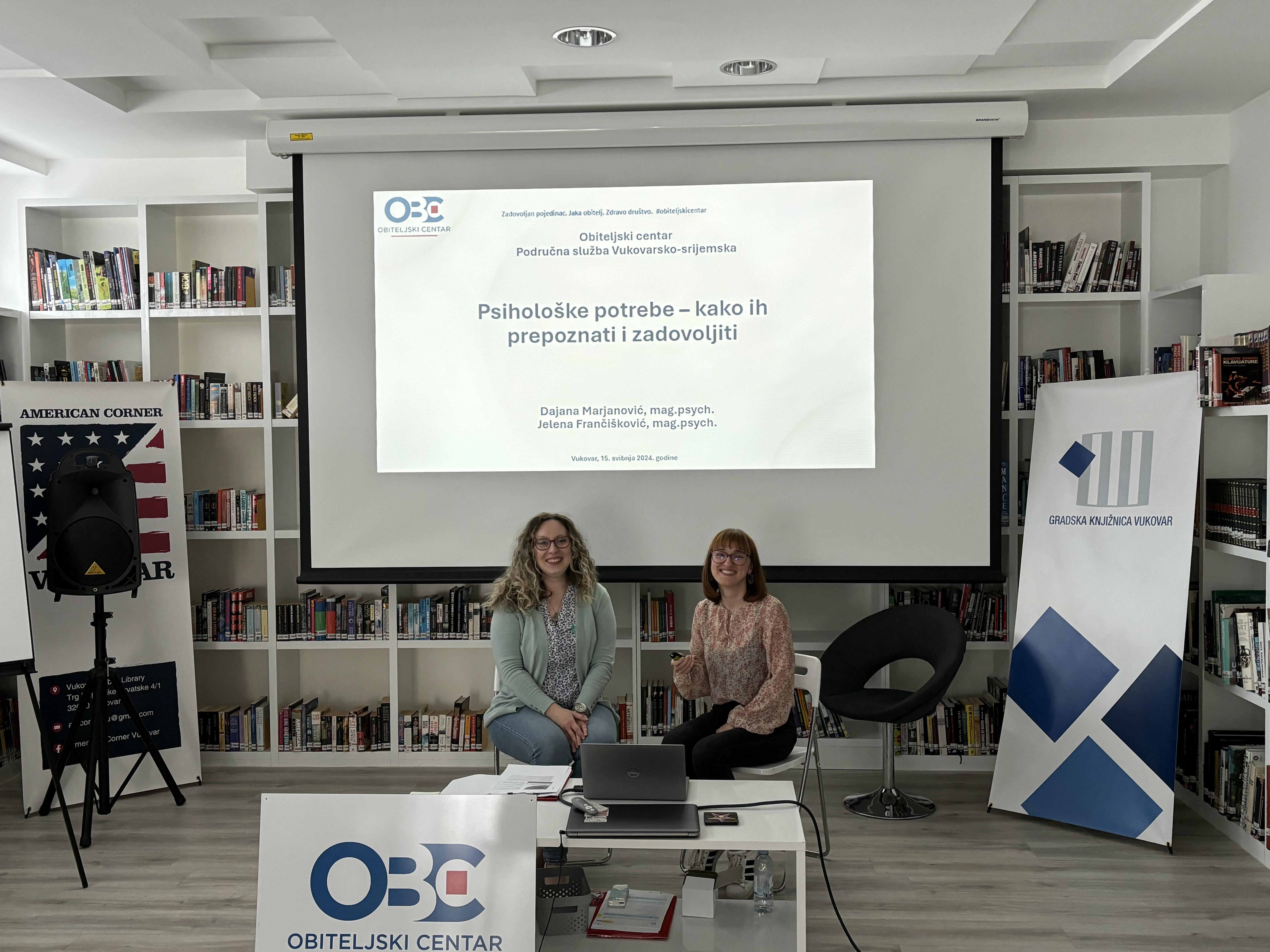 Povodom obilježavanja Međunarodnog dana obitelji, u okviru Europskog tjedna mentalnog zdravlja, dana 15. svibnja 2024. godine stručne radnice Dajana Marjanović i Jelena Frančišković održale su predavanje na temu „Psihološke potrebe – kako ih prepoznati i zadovoljiti'' u Gradskoj knjižnici Vukovar, Odjel Spajalica. Na predavanju su sudjelovali stručnjaci i šira javnost. Cilj predavanja bio je upoznati sudionike s temeljnim psihološkim potrebama, važnosti i načinima njihovog zadovoljenja. Evaluacija predavanja pokazuje da su sudionici zadovoljni. Navode da im se sviđa korisnost, zanimljivost i jasnoća predavanja, opuštena i ugodna atmosfera te da žele slične teme u budućnosti. U svrhu povećanja vidljivosti rada Obiteljskog centra te boljoj informiranosti korisnika sudionicima su podijeljeni informativni letci (djelatnost Obiteljskog centra).