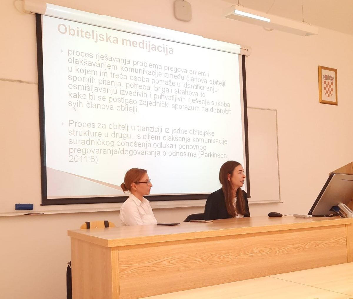 Dana 20. svibnja 2025. u suradnji Obiteljskog centra, Područne službe Splitsko-dalmatinske i Pravnog fakulteta Sveučilišta u Splitu, Katarina Anđić, mag.act.soc, univ.spec.mediat. i Jelena Martinović, prof.psih., univ.spec.mediat. održale su predavanje „Postupci obiteljske medijacije u praksi Obiteljskog centra, PS Splitsko-dalmatinske i besplatna pravna pomoć".