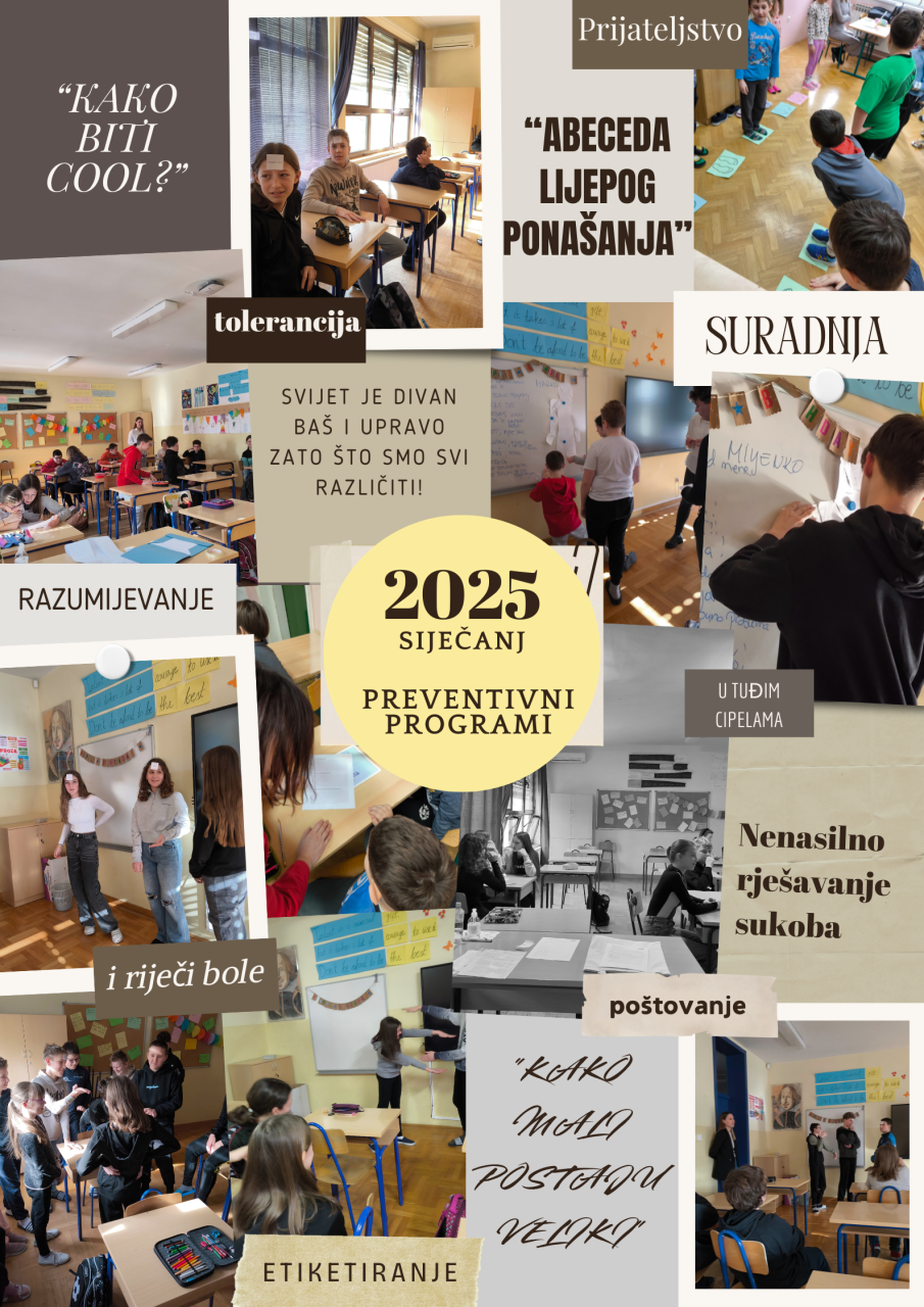 Tijekom siječnja započeli smo s provedbom većeg broja preventivnih programa s učenicima nižih i viših razreda osnovnih škola. Brojne situacije koje se javljaju u školskom okruženju, kao i njihov porast, iziskuju djelovanje u smjeru preveniranja, a nerijetko su one vezane uz pojavnost nepoštivanja, neprihvaćanja, odbacivanja, izrugivanja, teškoće emocionalne regulacije, frustraciju i neusvojene mehanizme za nošenje s nepravdom i neuspjehom.