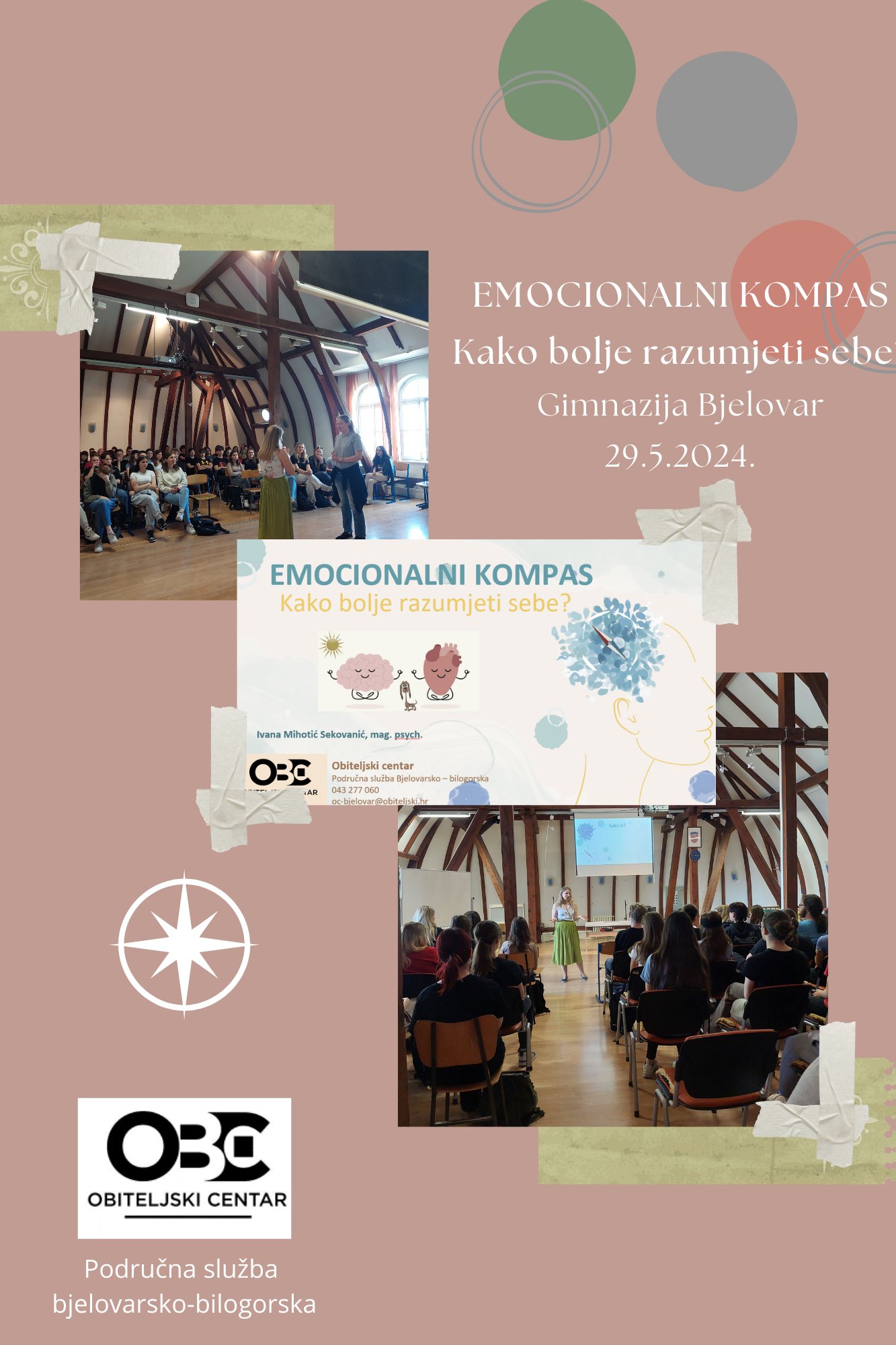 Obiteljski centar, Područna služba Bjelovarsko-bilogorska ostvarila je suradnju s Gimnazijom Bjelovar kroz njihov projekt „Knjiga na recept" gdje je stručna radnica Ivana Mihotić Sekovanić održala interaktivno predavanje "EMOCIONALNI KOMPAS - Kako bolje razumjeti sebe?".