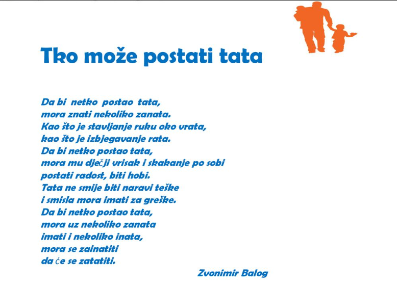 Radionica je namijenjena očevima djece različite dobi – od 0 do 18 godina – kako bi se postigla što veća razmjena informacija kroz bogatstvo vaših iskustava.
