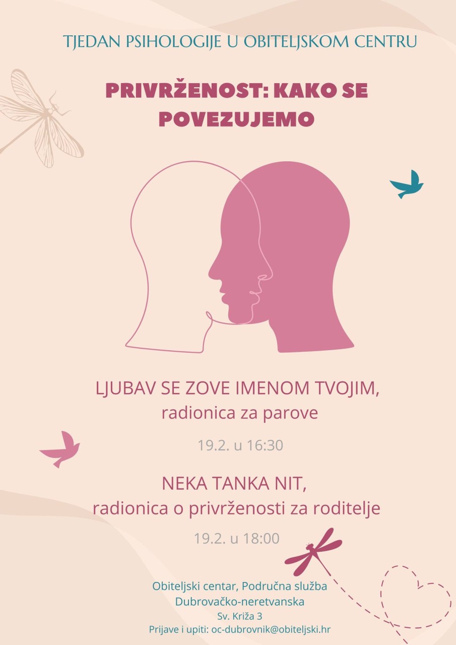 Povodom obilježavanja Tjedna psihologije u Obiteljskom centru, Područna služba Dubrovačko-neretvanska naše psihologinje osmislile su dvije radionice na temu PRIVRŽENOST: KAKO SE POVEZUJEMO.