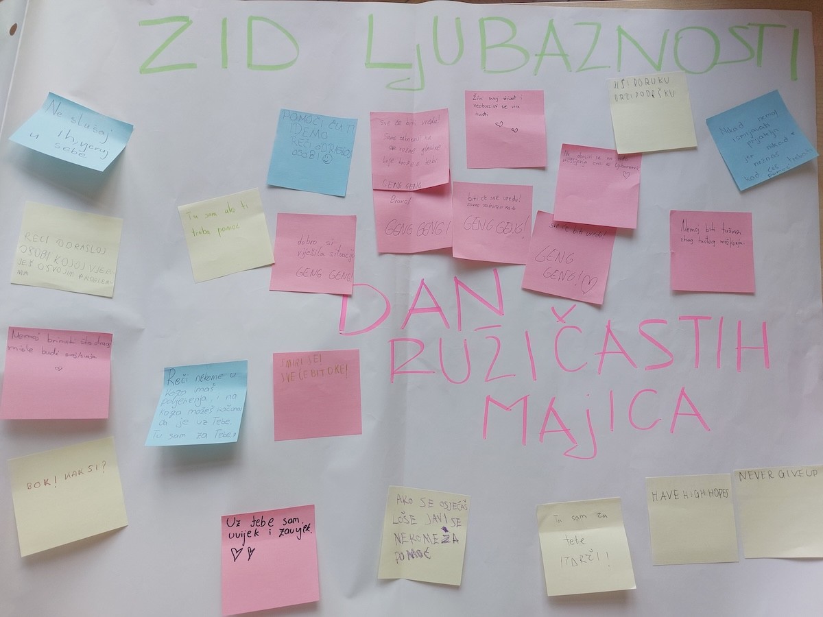 Povodom Dana ružičastih majica, u suradnji s Osnovnom školom Eugena Kvaternika, provedena je radionica s učenicima 6. razreda. Kroz problemske situacije, učenici su putem stripa kreirali rješenja za različite oblike vršnjačkog nasilja, razvijajući pritom kreativnost, empatiju i vještine komunikacije. Za kraj, zajedničkim su snagama osmislili i kreirali zid zahvalnosti – prostor ispunjen porukama podrške, ohrabrenja i zahvalnosti upućen svojim prijateljima, učiteljima i svima koji im pomažu u svakodnevnim izazovima. Ove poruke podsjećaju nas koliko su male geste ljubaznosti važne i kako svatko od nas može pridonijeti stvaranju sigurnog i podržavajućeg okruženja.