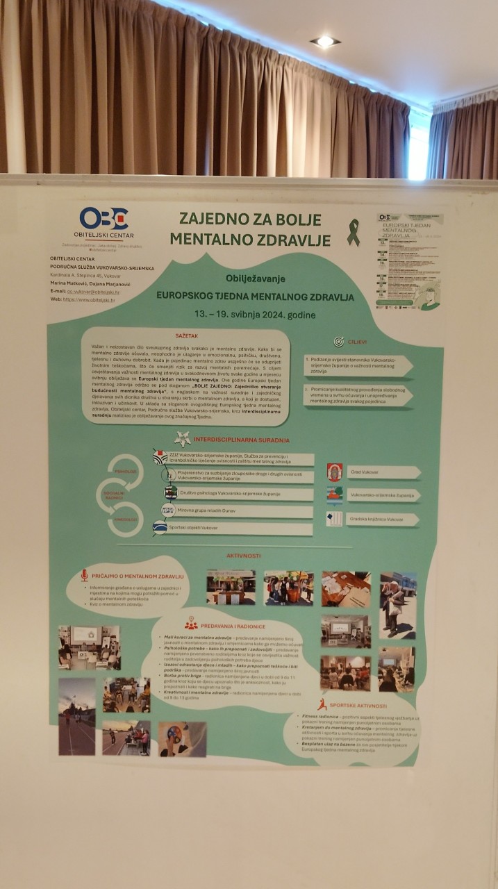 Kroz poster izlaganje predstavljene su aktivnosti provedene u sklopu Europskog tjedna mentalnog zdravlja koji je obilježen ove godine u organizaciji Obiteljskog centra, Područne službe Vukovarsko-srijemske u interdisciplinarnoj suradnji s važnim dionicima koji doprinose i rade na promicanju i očuvanju mentalnog zdravlja. Cilj poster izlaganja bio je prikaz dobre prakse interdisciplinarne suradnje kroz koju se zajednički djelovalo na poboljšanju sustava skrbi o mentalnom zdravlju.