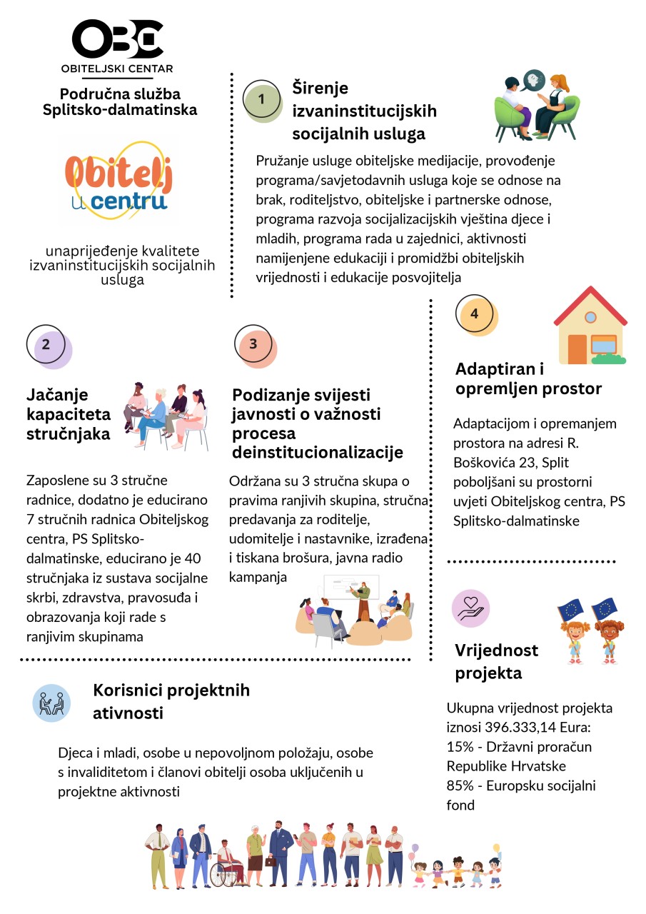 Na poster prezentaciji istaknuti su osnovni ciljevi i postignuća provedenog projekta „Obitelj u centru": programi podrške djeci i mladima, rad s obiteljima, savjetovanje i edukacije te specifične programe usmjerene na poticanje pozitivnih promjena u obiteljima i zajednici.