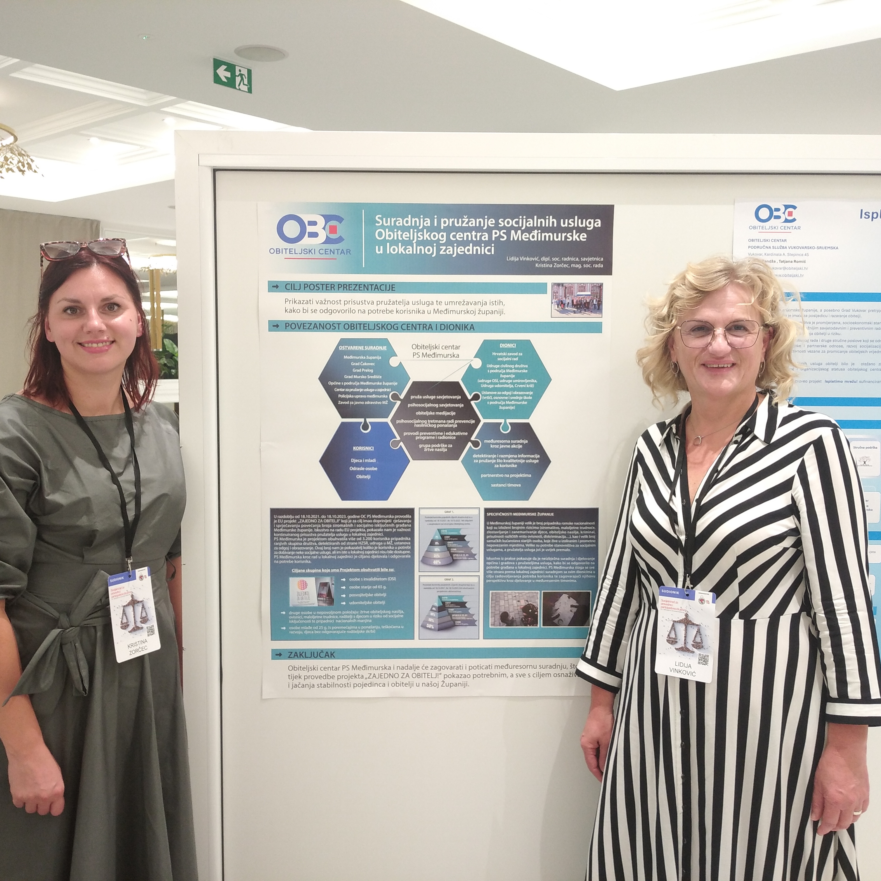 Stručne djelatnice Obiteljskog centra Područne službe Međimurske aktivno su sudjelovale na XIII. Konferenciji socijalnih radnika koja se je održala u Vodicama od 23. do 25. rujna 2024. godine. Putem poster prezentacije pod nazivom „Suradnja i pružanje socijalnih usluga Obiteljskog centra Područne službe Međimurske u lokalnoj zajednici" prikazani su svi dionici koju su ključni da bi se kvaliteta života korisnika poboljšala, s naglaskom na važnost uključenosti Područne službe Međimurske u lokalnu zajednicu s ciljem osnaživanja i jačanja stabilnosti pojedinca i obitelji.