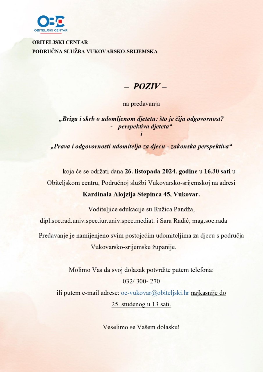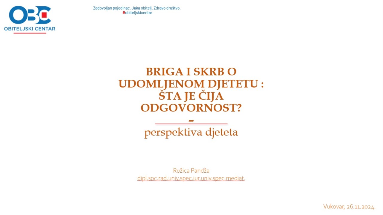 Predavanje pod nazivom „Briga i skrb o udomljenom djetetu: što je čija odgovornost?- perspektiva djeteta" održala je stručna radnica naše Područne službe Ružica Pandža, a predavanje „Prava i odgovornosti udomitelja za djecu- zakonska perspektiva" održala je stručna radnica ispred Tima za udomiteljstvo Vukovarsko- srijemske županije Sara Radić.