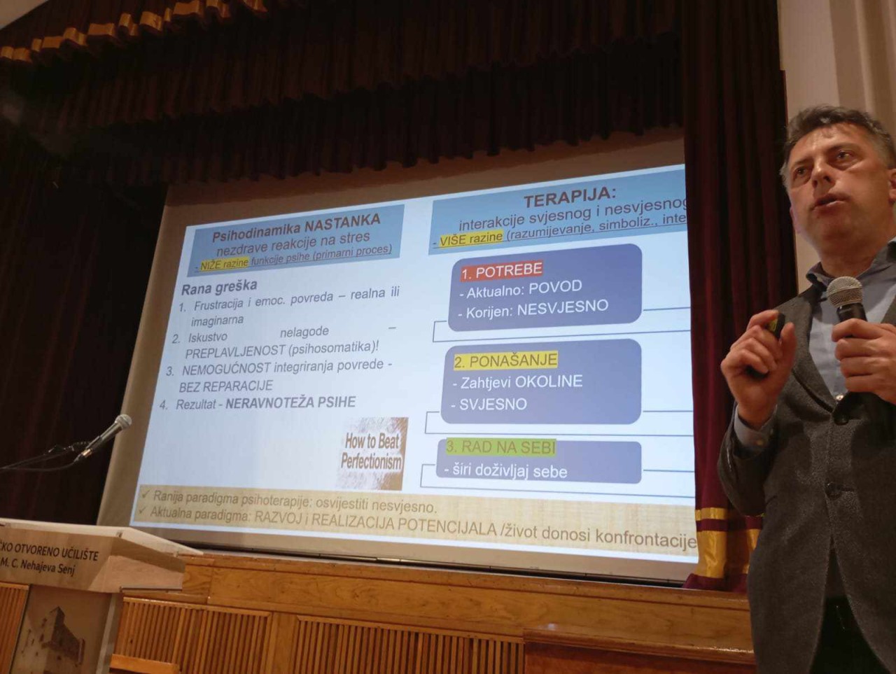 Veliko nam je zadovoljstvo bilo organizirati i prisustvovati predavanju prof. dr. sc. Darka Marčinka, dr. med., predstojnika Klinike za psihijatriju i psihološku medicinu Kliničkog bolničkog centra Zagreb i pročelnika Zavoda za personologiju, poremećaje ličnosti i poremećaje hranjenja te redovitog profesora na Medicinskom fakultetu Sveučilišta u Zagrebu, koji kroz svoje brojne javne istupe i predavanja progovara o važnim temama s područja mentalnog zdravlja. Tema predavanja bila je „Mentalno zdravlje djece i mladih – stabilizacija stresa". Profesor Marčinko je pritom naglasio važnost prvih pet godina života za razvoj cjelokupne ličnosti kao i važnost formiranja dobrih odnosa pri čemu se stavlja veliki naglasak na roditelje i učitelje koji čine najbližu okolinu djeteta. Profesor se također osvrnuo na izazove današnjeg vremena, porast narcizma u populaciji, naglašenu kompetitivnost u društvu te konzumerizam. Kao odgovor na spomenute izazove naglasio je važnost jačanja empatije u društvu, kako kod mladih, tako i kod starijih, a sve kako bi se prevladao utjecaj nepovoljnih okolnosti, jer na kraju, ono što se pokazalo važnim za zdravlje, sreću i dugovječnost nisu novac ili moć već su za to ključni dobri odnosi. Dobar život nije nužno lagodan život, već život u kojem postoji smisao, u kojem postoje i ugodne i neugodne emocije s kojima se uspješno nosimo, te dobri odnosi u zajednici. Nakon održanog predavanja prisutni su imali brojna pitanja vezana uz podršku mentalnom zdravlju djece i mladih, a veliki odaziv na ovu javnu tribinu uistinu je pokazao potrebu i želju roditelja, odgojnoobrazovnog osoblja te svih drugih koji su u izravnijem kontaktu s djecom za usvajanjem novih znanja s područja zaštite mentalnog zdravlja.