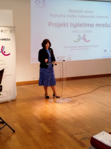 Program završne konferencije započet je pozdravnim riječima ravnateljice Obiteljskog centra Ivane Šešo, a dalje su uslijedili kratki govori v.d. predstojnika Hrvatskog zavoda za socijalni rad, Područnog ureda Vukovar, Zvonimira Rogulje kao prvotnog korisnika projekta te Zrinke Čobanković, ravnateljice Razvojne agencije Vukovarsko-srijemske županije koja je pružala stručnu podršku tijekom projekta. Partner na projektu Ispletimo mrežu je Vukovarsko-srijemska županija ispred koje je pročelnik Upravnog odjela za zdravstvo i socijalnu skrb, Mario Adamović u svom govoru dao dodatnu potporu